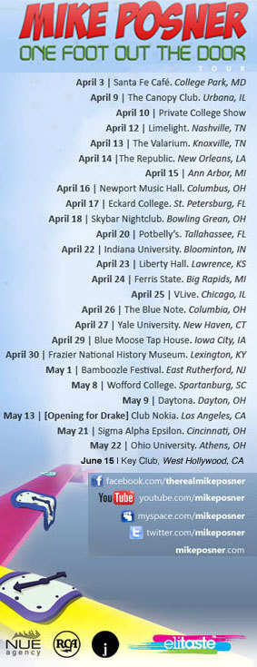 Come check out Mike Posner on tour in some more intimate venues before he heads out on Warped Tour this summer and heads to the stratosphere. Highlights include The Bamboozle Festival at Giants Stadium, opening for Drake at Club Nokia in LA and a Los Angeles Key Club show with Chiddy Bang a week before Warped Tour.